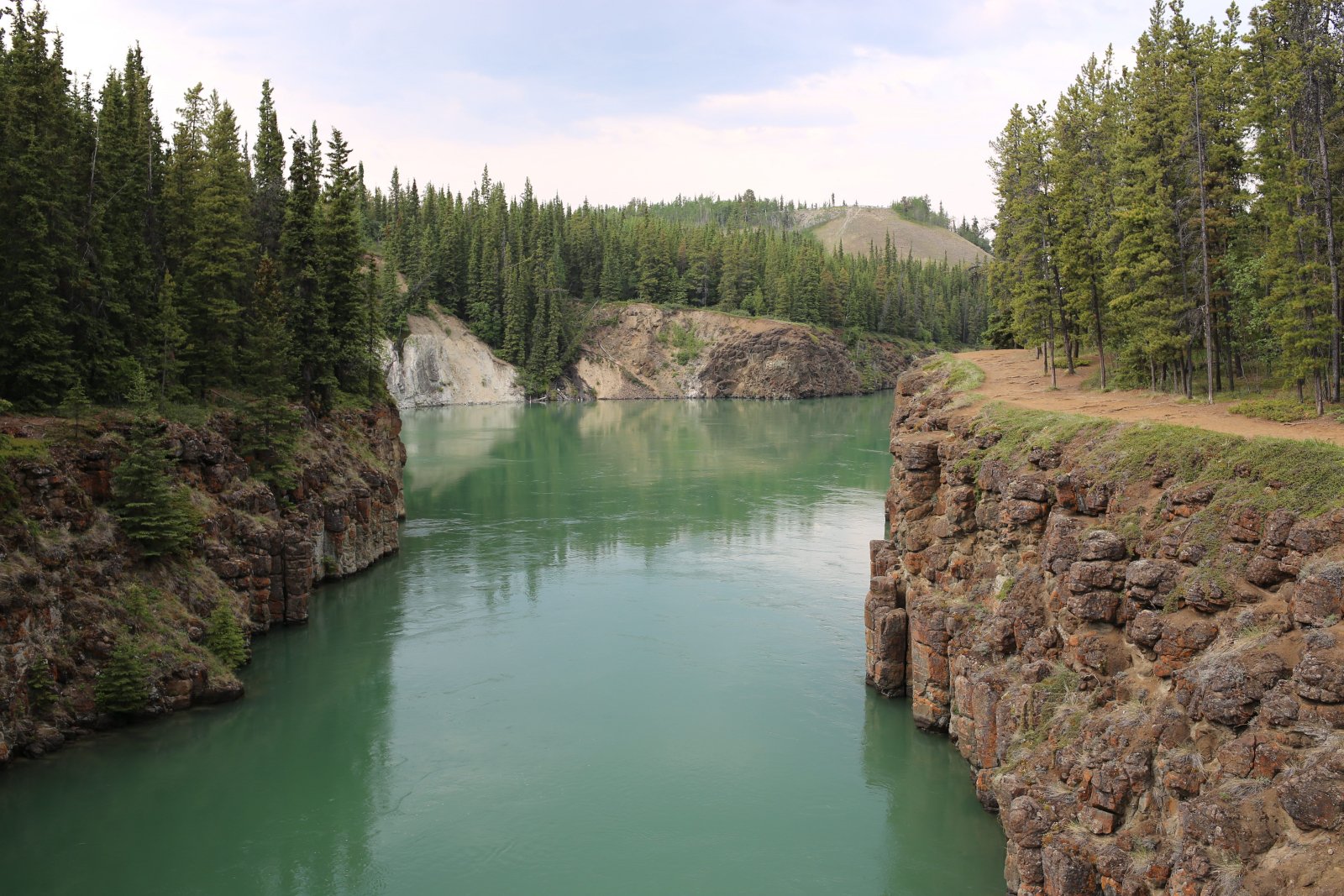 | Our first glimpse of the Miles Canyon through which the Yukon River flows. Here looking south. |