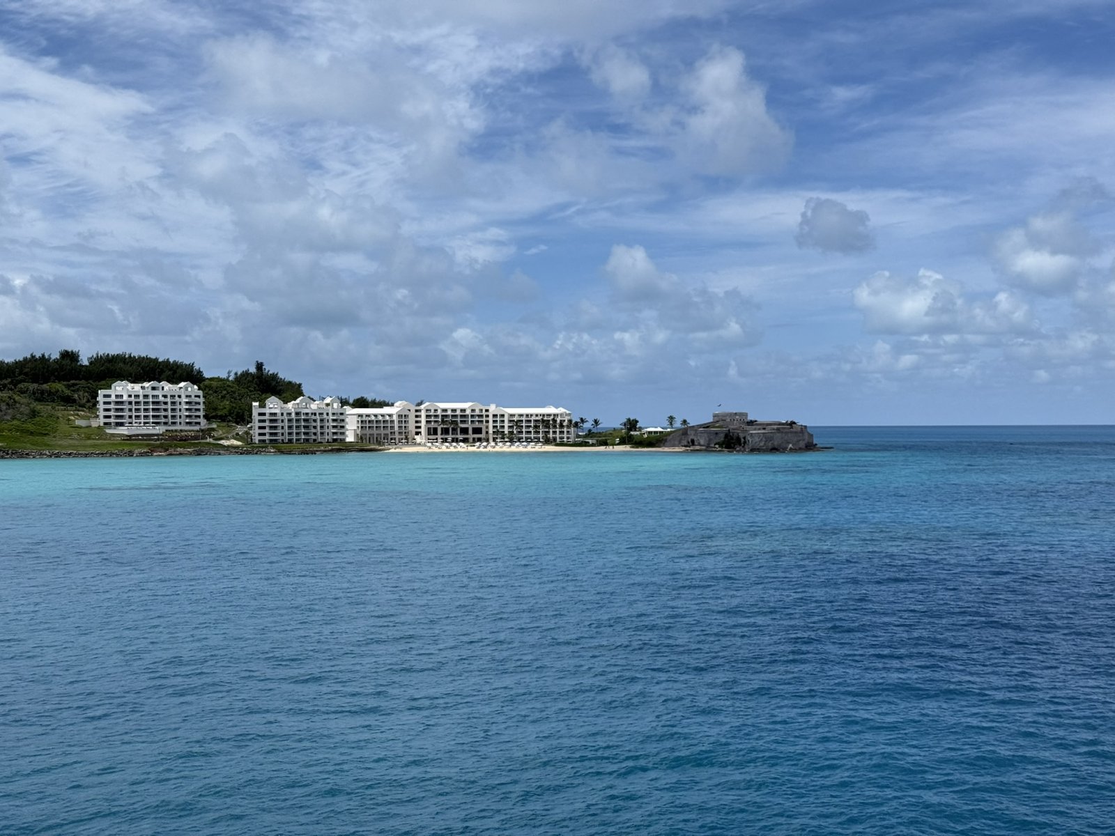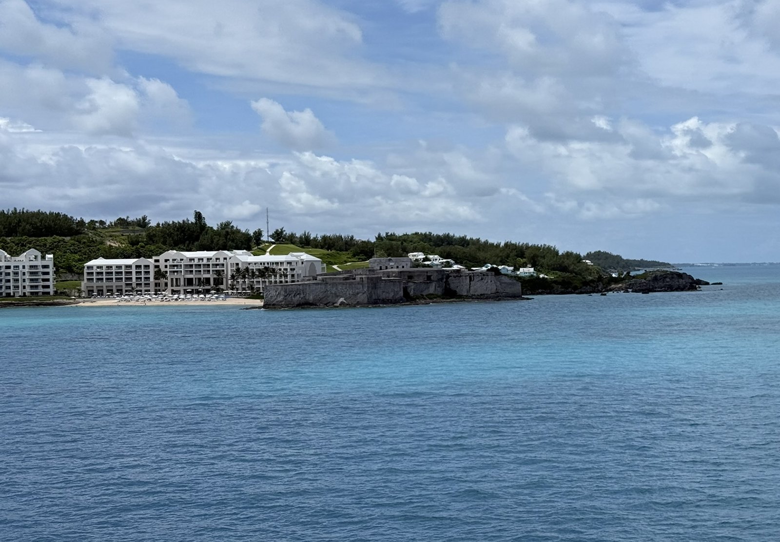 A good look at the St. Regis Bermuda Resort on the left and Fort St. Catherine on the right. The St. Regis is a four-star hotel. They say it's nice because it's away from cruise ship crowds. Fort St. Catherine, or Fort St. Catherine's (as it is usually referred to), is a coastal artillery fort at the North-East tip of St. George's Island, in the Imperial fortress colony of Bermuda. Successively redeveloped, the fort was used first by Bermudian Militia and then by regular Royal Artillery units from 1612 into the 20th century. Today it houses a museum. |