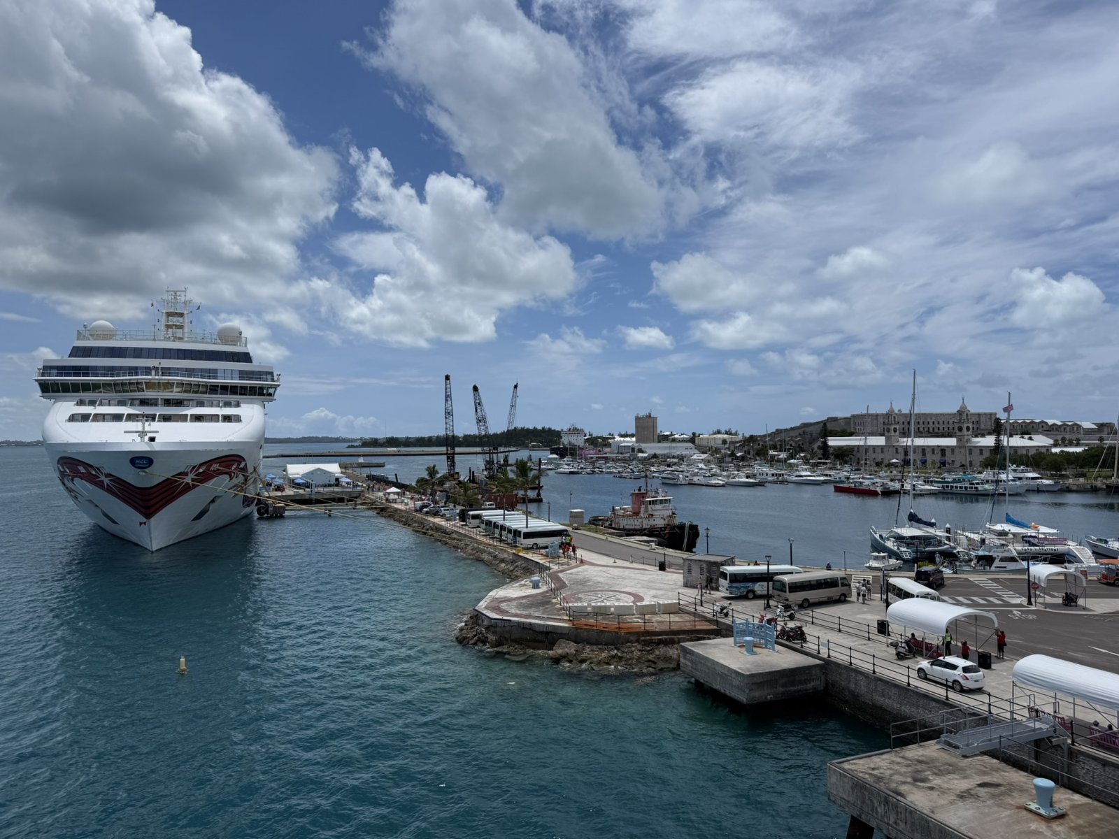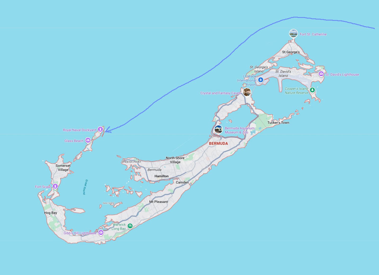 A look at the Bermuda map might be helpful at this point. Vision of the Seas arrived from the east (right side of map) -- not sure how we ended up coming in from the east -- and cruised west past St. George's along Bermuda's northern edge to the Dockyard Wharf.