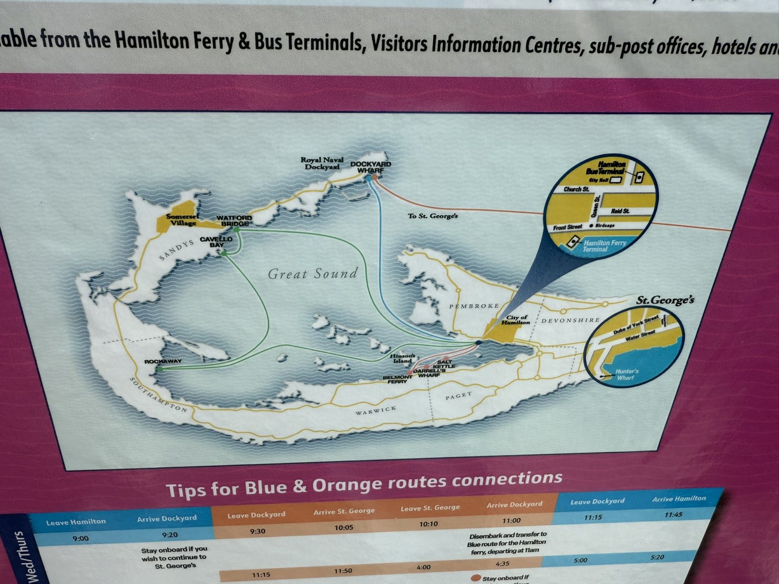 A ferry map of Bermuda's eastern half. We would be taking the ferry from the Dockyard Wharf to Hamilton.