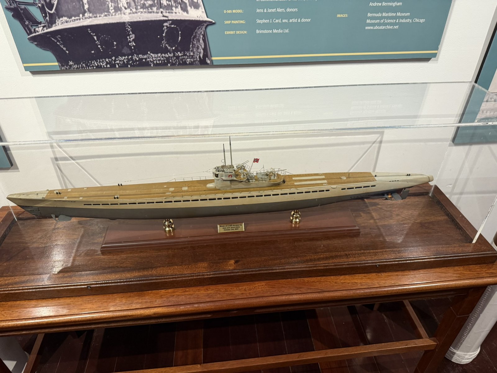 | A model of the German U-boat U-505 which was captured by an American hunter-killer task force off the coast of Africa. The U-505 was towed all the way to Bermuda where the sub and crew were kept until the end of World War II. | ||||||