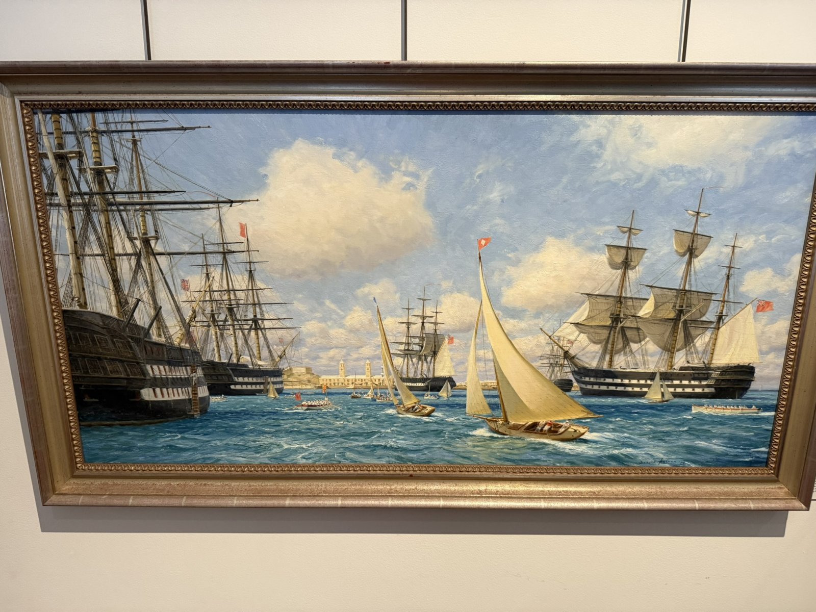 A painting titled The Royal Naval Fleet at Anchor in Grassy Bay, 1861, painted by Deryck Foster in 1986. Most of these ships had auxiliary steam engines as well as sail. |