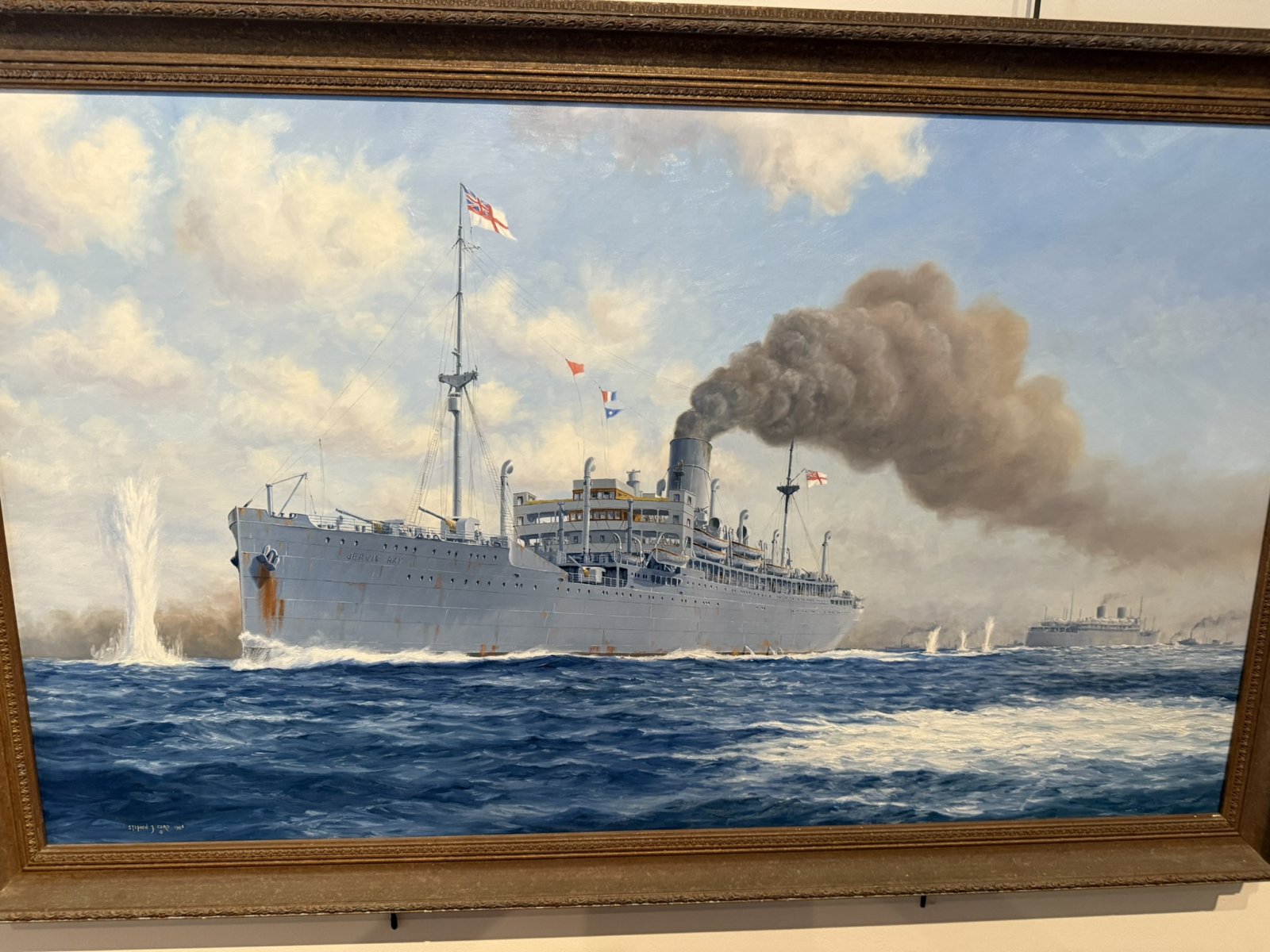 | A painting of the HMS Jervis Bay, an armed merchant cruiser based out of Bermuda performing trans-Atlantic convoy escort duties in World War II. On November 5, 1940, a convoy Jervis Bay was escorting was attacked by a German pocket battleship, Admiral Scheer. Jervis Bay engaged the Scheer in a sacrificial action which allowed the convoy to disperse but Jervis Bay was sunk with the loss of 187 men including the Captain E. Fogarty Fegan who received the Victoria Cross posthumously. | ||||||