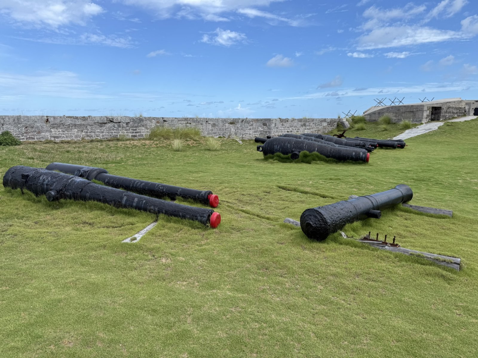 Cannons laying about in the grass.