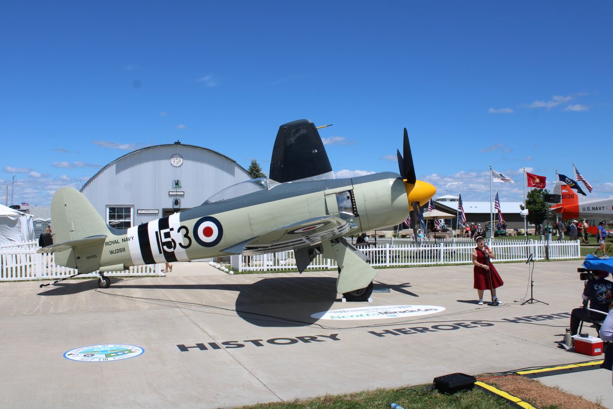 This year at AirVenture I made a major personal discovery: Warbirds in Review. It's like a forum. Twice a day, they take a Warbird (or two or four) and put it on display in front of some bleachers. A panel of experts -- the owner, the pilot, the museum curator, a historian -- with a moderator, and discuss the Warbird for an hour or so. Prior to the show talented singer Theresa Eaman -- pictured below at right -- sings period songs. She has an incredible voice. The first Warbirds in Review I went to was supposed to be a de Havilland Mosquito but when I arrived a Hawker Sea Fury was sitting at show center. I stayed anyway and really enjoyed it. I didn't know much about the Sea Fury. It turns out the Sea Fury was introduced in 1947, two years after the end of World War II. It represented the latest technology, and as a result, is probably the best single piston-engine fighter plane ever produced. Maybe the Grumman Bearcat comes close. Of course, the jets were on the scene by then and were clearly the future. The Sea Fury's engine was the powerful Bristol Centaurus. 864 Sea Furies were built. Some still fly at the Reno Air Races. |