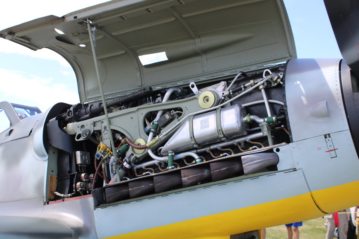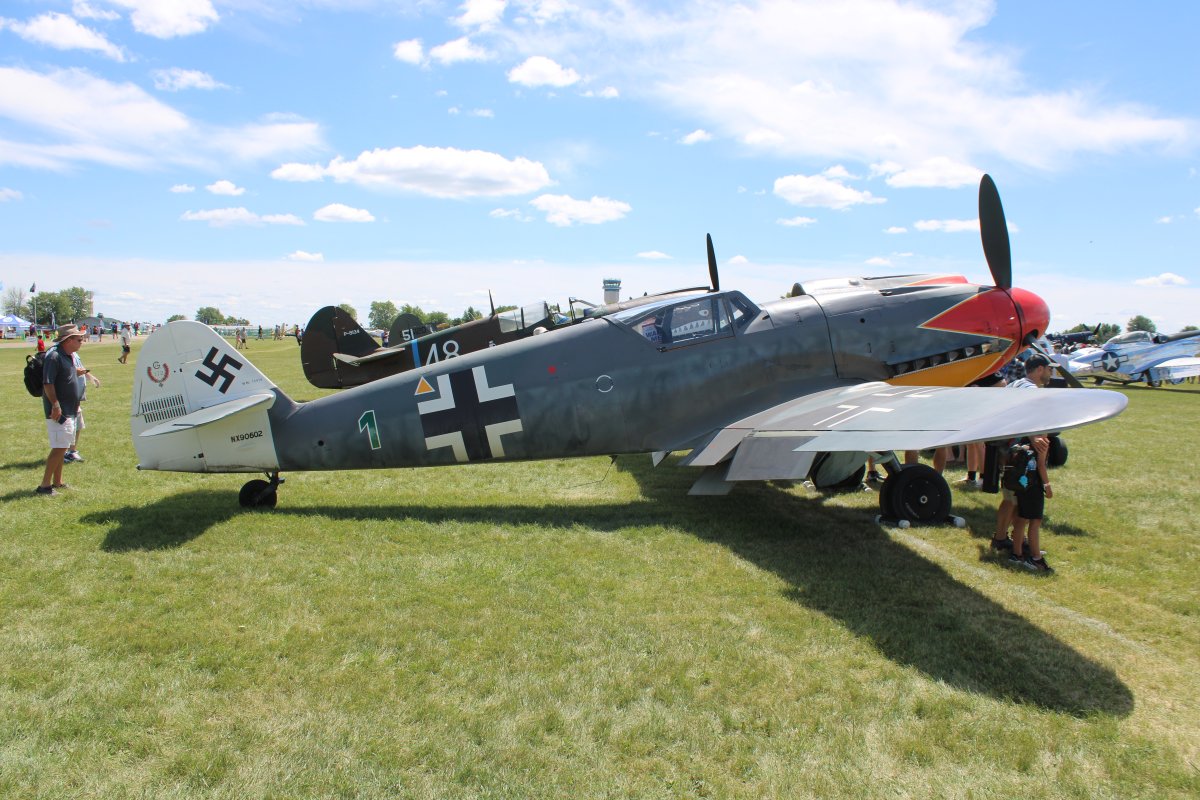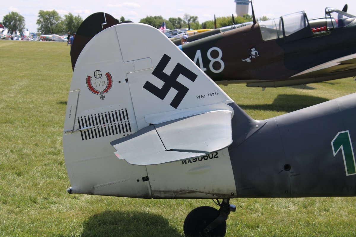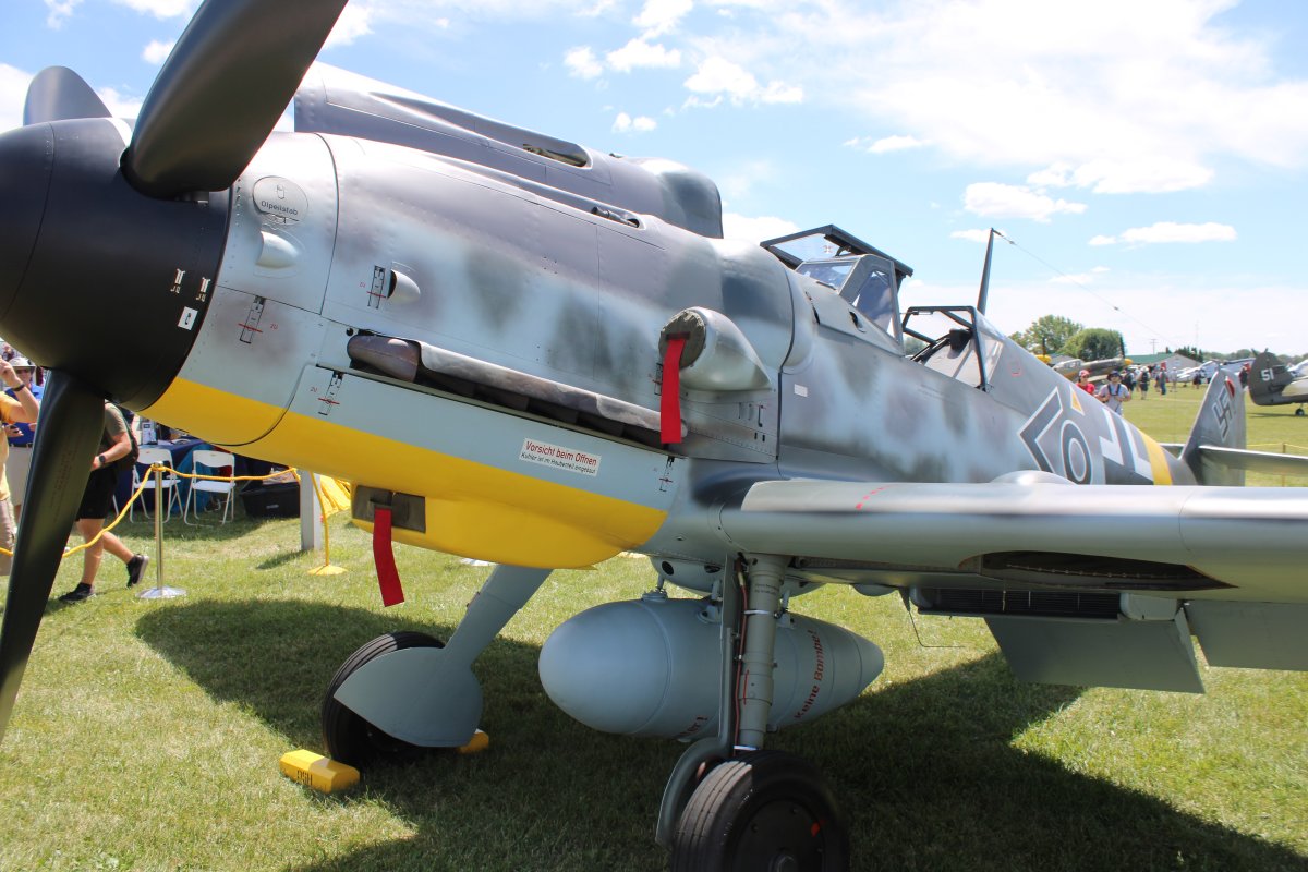 | The 109 on the right was a Spanish-built 109 used in the Battle of Britain movie. It used the British Merlin engine and had a cowl that just looked wrong. On this particular 109, they replaced the Merlin with an Allison engine which allowed them to use a cowl almost identical to the original 109G cowl. This airplane has the paint scheme flown by the Luftwaffe ace Hermann Graf. In about 830 combat missions, he claimed a total of 212 aerial victories, almost all of which were achieved on the Eastern Front. | ||||||